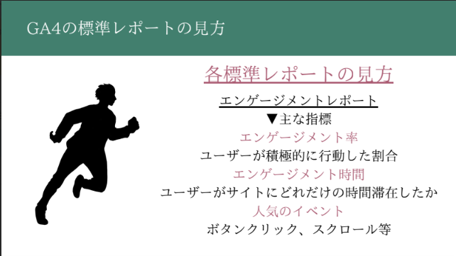 - GA4の標準レポートの見方(エンゲージメント、トラフィック、ユーザー属性)
