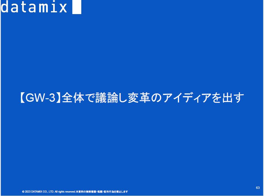 皆さんには、現在の会社の状況をデータとしてお渡ししますので、どのように変革すべきかをチーム内で議論し、変革のためのマイルストーンの作成をしてください。