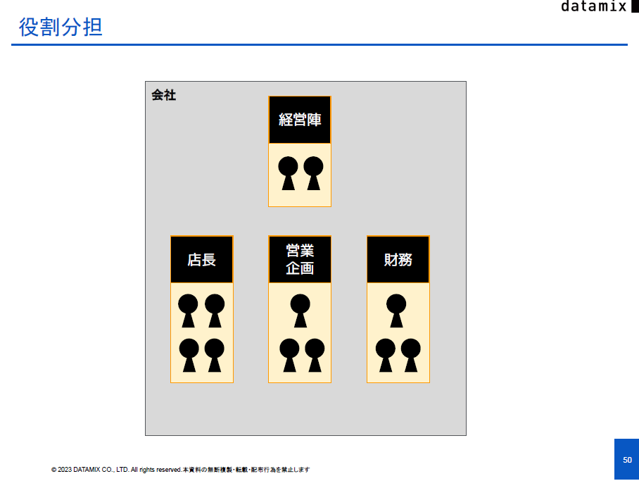 各役割内の議論+経営会議での議論を行いながら全体の利害関係を調整し会社の変革を目指していただきます。