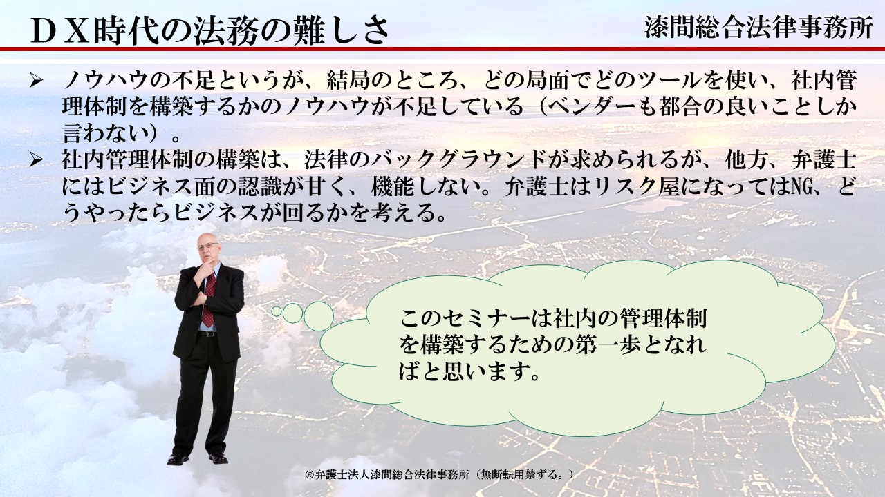 これまで「法律は専門家の仕事」され、弁護士等外部任せにされることが多い分野でしたが、変化のスピードの加速、業務の複雑化は、法務の面においても「まずは自分で考えてみる」ことを求められるようになってきております。