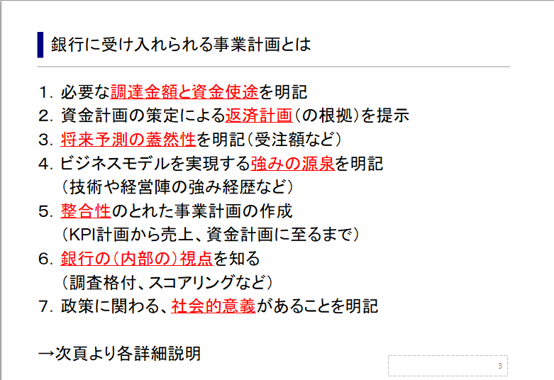 ▼金融機関からの「借入」、投資家からの「出資」、また、「助成金の獲得」に向けて、申請時における事業計画の策定ノウハウを習得できる。
